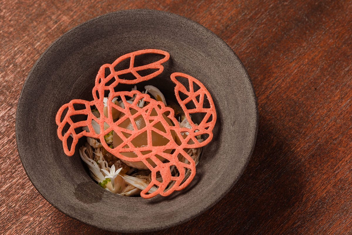 The extraordinary meal began with an amuse-bouche trifecta that evoked the visual flair of the chinoiserie, including a Chicken Terrine by Su. The savoury chicken terrine was elevated by the natural sweetness of the cured and cooked mud crab, whose flavours burst in the mouth. This was cleverly finished with a tuile in the silhouette of a crab (ironically made with prawn), which added a crisp, umami-laced finish that tied the dish together.