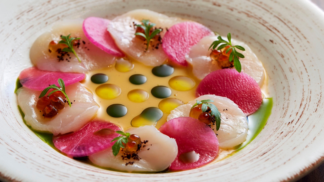 I began my dining experience with a refreshing and aromatic iced cardamon vanilla latte along with a visually intriguing pineapple passion cooler. For appetizers, I opted for their charred chili hummus infused with mixed herbs, served alongside two pieces of freshly made bread—the hummus offered a touch of smokiness, heightened by an ambrosial blend of herbs. Following that was a bracing plate of rocket parmesan salad, featuring a mix of arugula, beets, tomatoes, and Parmesan—all brought together with a zesty citrus dressing. My taste buds were then treated to a pleasing plate of Hokkaido scallops crudo, decked with passionfruit, radish, and sumac.