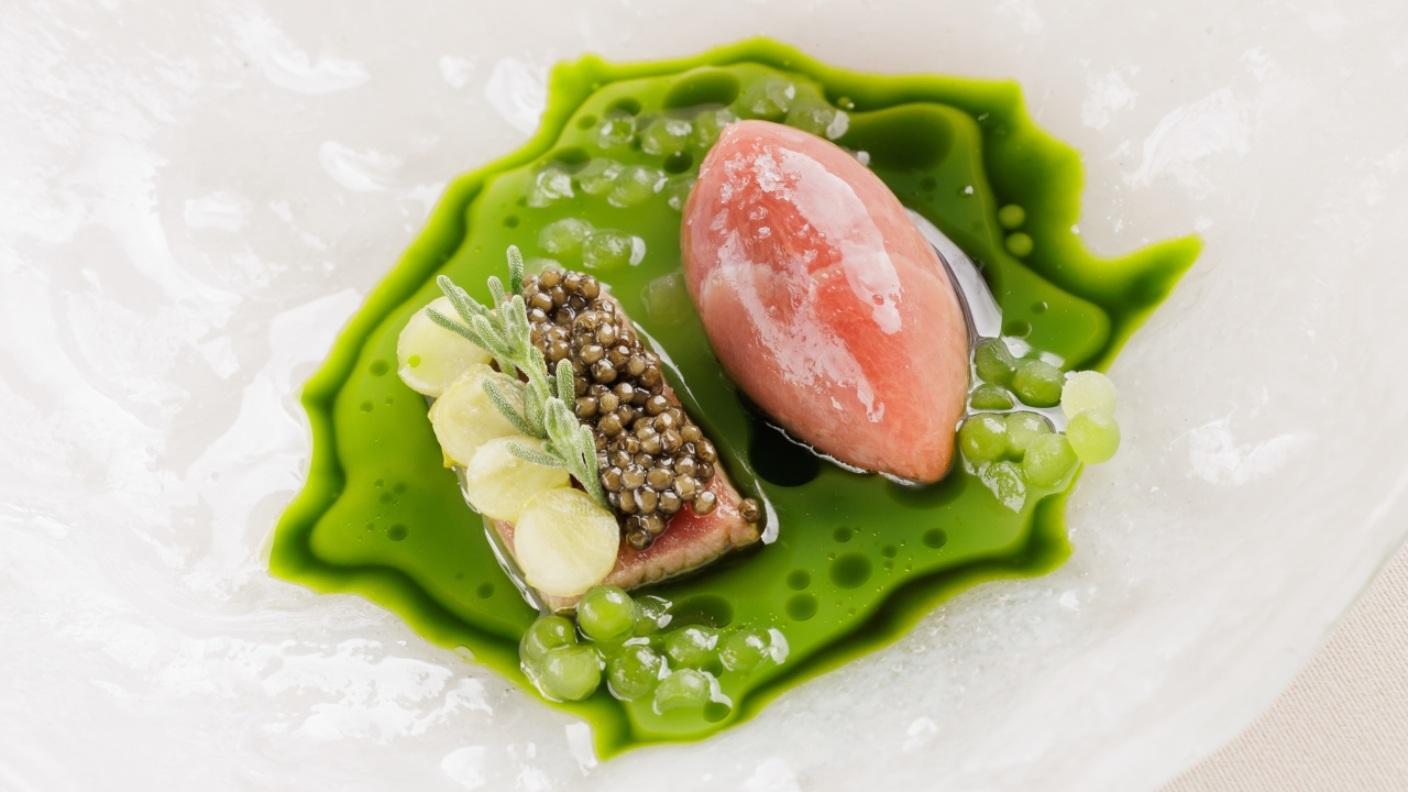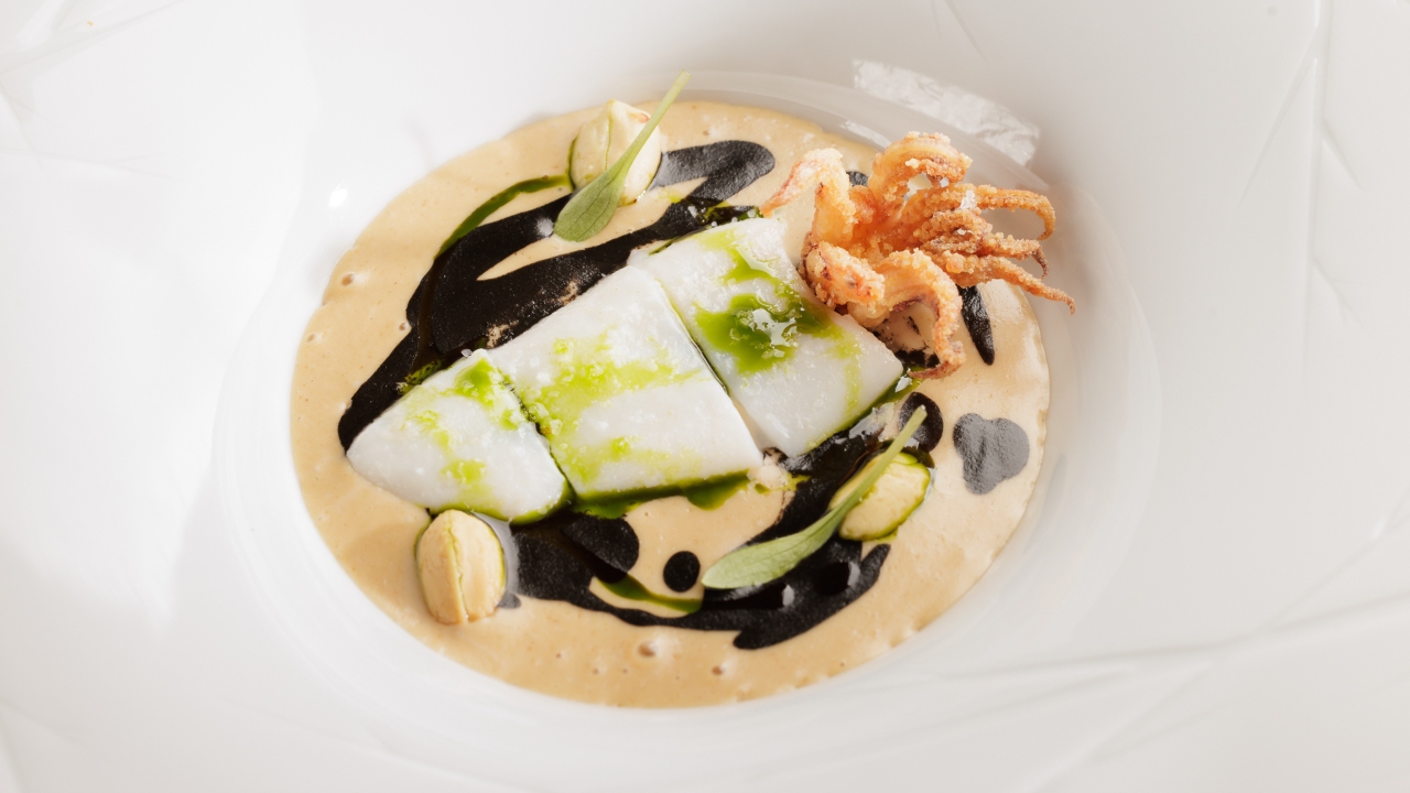 Taste buds now fully awakened, dinner proceeded with the exploration of tuna in two delectable ways: a thick slice of fatty tuna adorned with Imperial caviar and a fusion of tuna with oyster. To balance out the richness of the flavours, a refreshing cucumber sauce was expertly paired. Like with the previous dish, the cuttlefish course that followed showcased dual techniques—fried and grilled. Served on a bed of creamy peanut and black ink sauce, textures combined with nutty notes and briny flavours to deliver a contrast in taste that just came together beautifully.