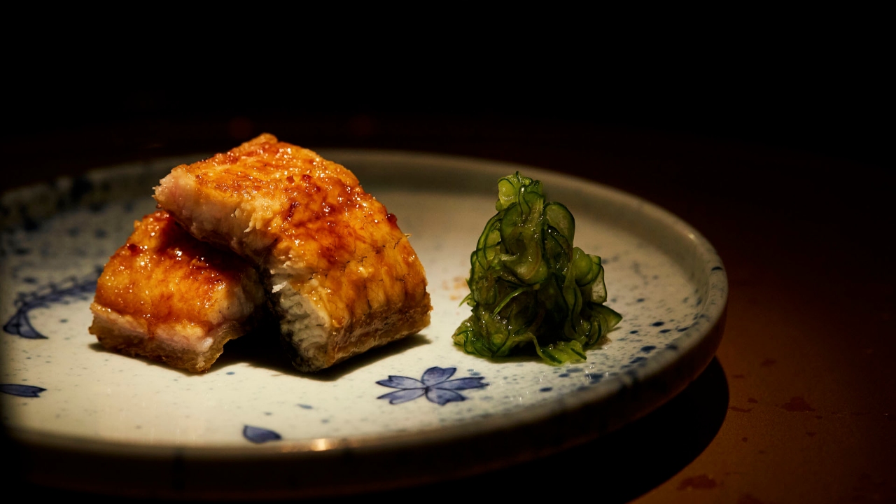 Next, some fresh hirame (flounder) sashimi from Hokkaido was served, followed by a heartwarming amadai (tile fish) clear soup that was elevated with kombu and intensified with grilled manganji peppers for a hint of sweet yet subtle smokiness. The Kaiseki experience was further enhanced as Chef Fujita skilfully worked the grill to orchestrate the charcoal-grilled wild unagi (eel) from Kumamoto. The rustic warmth of the succulent unagi was paired with a tare sauce that added an extra layer of depth to the dish which, to me, was the crown jewel of the evening.