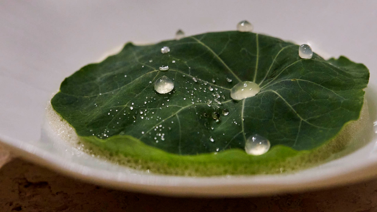 The next conceptual course captivated my tastebuds and imagination as it appeared like a lily pad plucked out of a pond from a fairytale. The beautifully lush Nasturtium leaf, which carries a mildly peppery flavour with an aroma reminiscent of mustard, was layered with lemon gel. Tucked underneath the peltate leaves were grilled mantis prawn with its intense sweetness, mussel and crispy braised lotus root with lotus seed. This was accompanied by a favourite ingredient of Chef Johnson, buah kulim sauce, which gives it a truffle and nut finish.