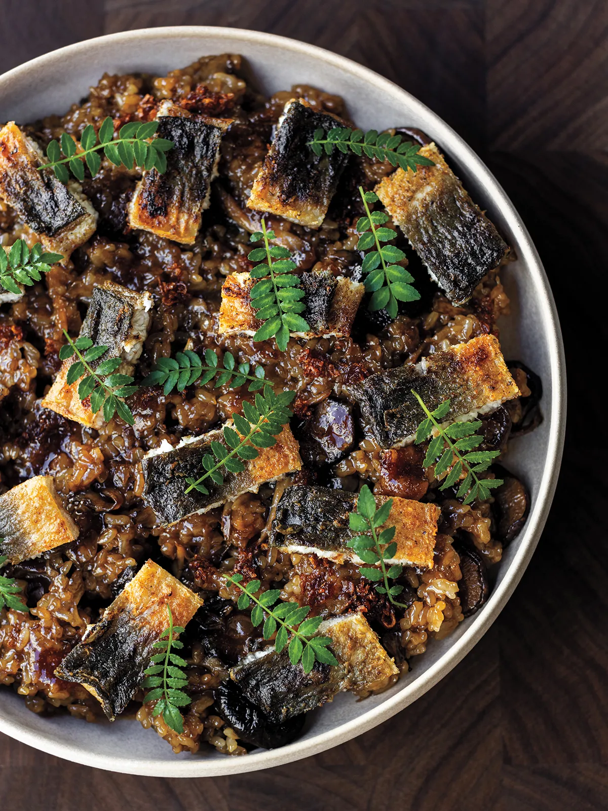 To mirror a conventional starter of cold cuts, Yao created a rendition of husband-and-wife salad, a popular Sichuan dish of thinly sliced beef and beef offal. Kato’s version dresses slices of pig-ear terrine, beef-tendon terrine, and braised Wagyu cheeks in a mustard and sesame sauce. A whole steamed fish pays homage to how Yao’s mother prepared a similar dish—in the microwave—when he was young. Now, he takes Tokyo negi (a type of scallion, here sourced from Girl and Dug Farm in San Marcos) and scalds it with ginger to make an aromatic dressing for the catch of the day. “Yesterday we did golden-eye snapper from Japan, which is so expensive right now, but it’s about pairing a really simple technique with the best thing we can find,” says Yao. The rice course is made with fresh and dried mushrooms, topped with a binchotan-grilled Japanese eel that’s brushed with a char siu marinade made with local wildflower honey and five spice, instead of the usual eel sauce. “Everything has a story or a very strong parallel,” he adds.