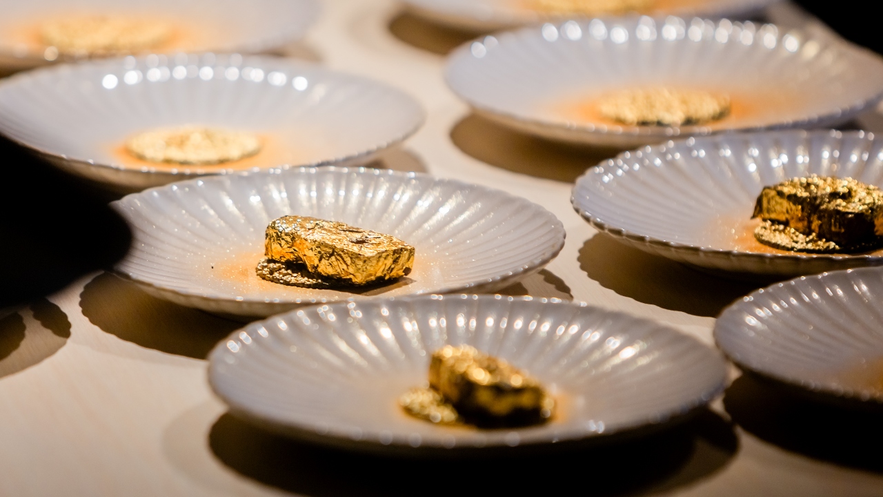 Guest gathered around the chefs again as they skilfully flambéed Miyazaki A5 Wagyu to perfect doneness wrapped in 24k edible gold leaf.