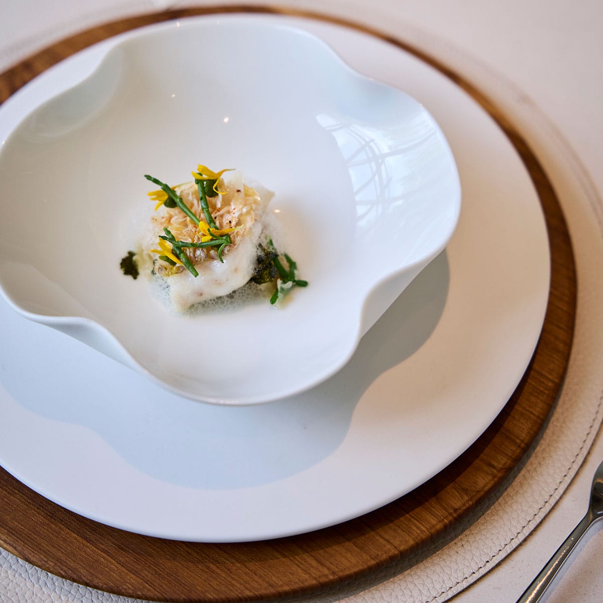 Bite-sized and delicately assembled, the amuse-bouche arrived like miniature works of art—from Potager’s tansho-grilled eel pie and silver belt fish tarte to Eatanic Garden’s mussel japchae. Of the selection, however, the parae seaweed crane brought a moment of pause for its arresting presentation. Earthy and crisp, the folded crane resembled a graceful bird perched atop a bed of edible flowers. It felt almost too beautiful to eat, as though one were plucking a precious object from a blooming garden.