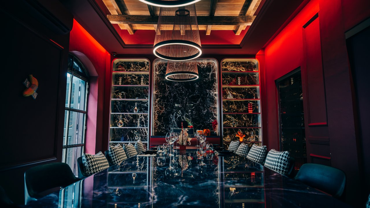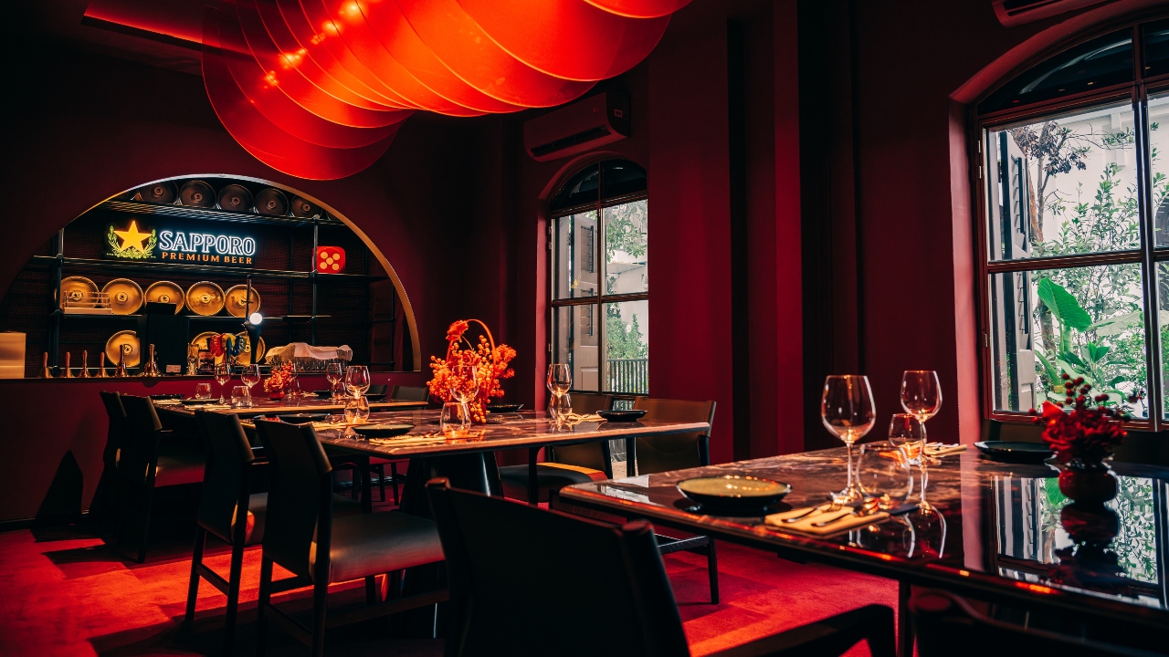 The Modern-Thai inspired restaurant and bar is located in a gorgeous heritage house from the 1870s, which Chef Ton fell in love with after rejecting numerous other locations. Although the exterior of the building is deliberately plain white, its interiors are painted a playful, seductive red, while the original mosaic tiled floor adds a traditional touch. Sculptures and art pieces are dotted around the five dining spaces, such as a wireframe sculpture of a rider on horseback, a nod to the building’s colonial roots. One of the spaces is a private karaoke room that seats 14, which really encapsulates their concept of fun dining.