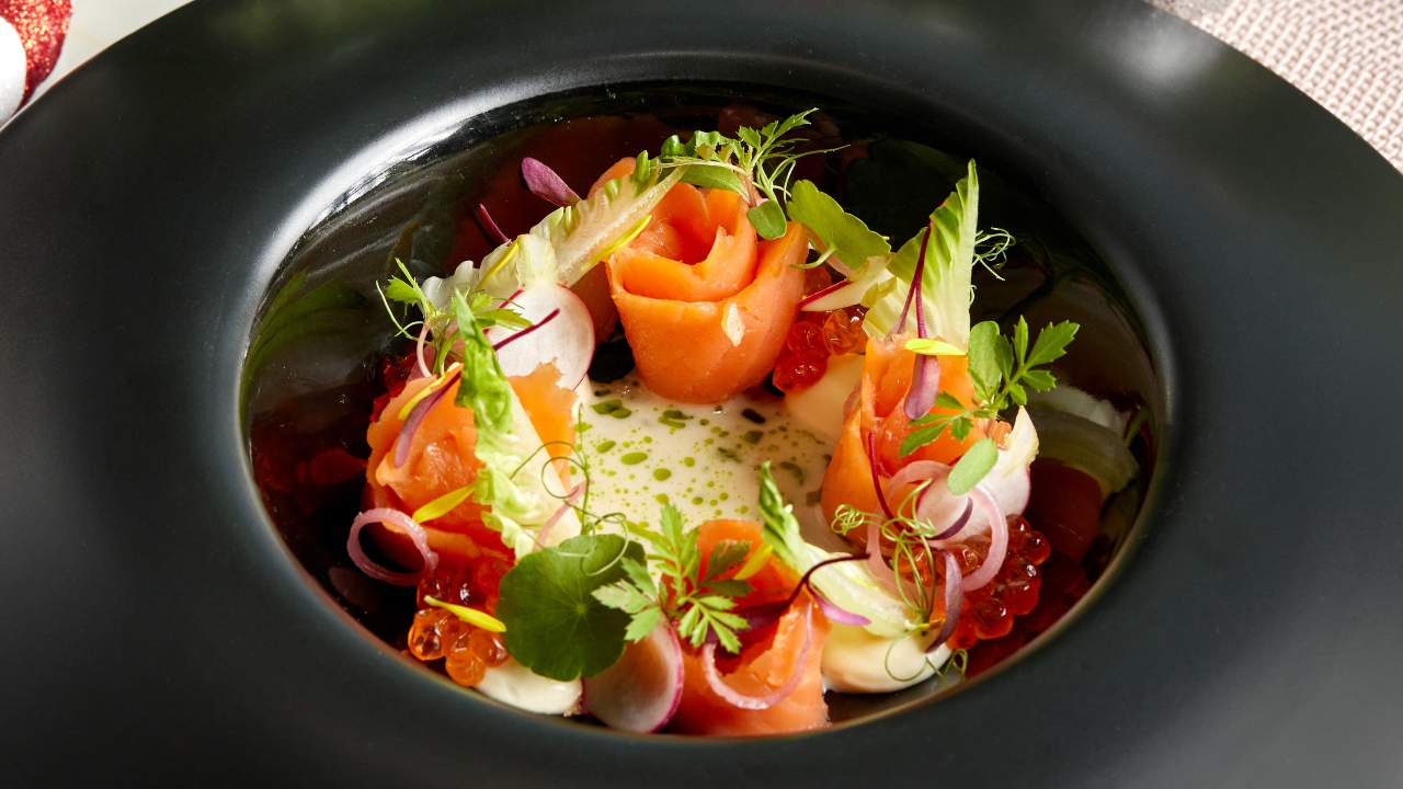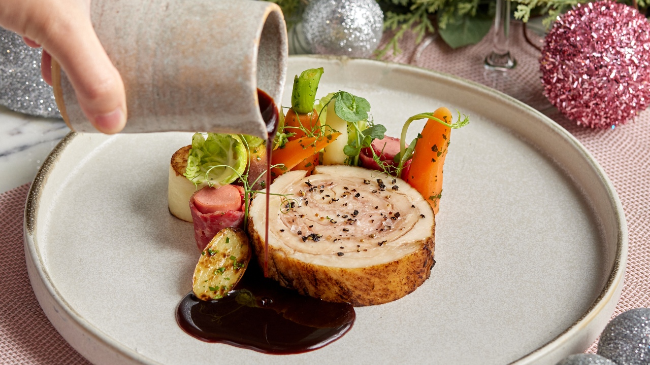 The festivities during the four-course lunch kick off with a delectable selection of appetizers. Smoked Duck and Chicken Liver Terrine are served with spiced orange chutney, local rocket and toasted brioche, all of which are a delightful harmony of textures. The Scottish Smoked Salmon, served alongside wasabi cream cheese, soy-cured salmon roe and heritage radish, is another joyous Christmas starter. Then, the refreshing Highland Beetroot, sourced from Cameron Highlands, is paired with watercress, toasted sesame, and goat’s cheese ice cream, and is nothing short of divine.