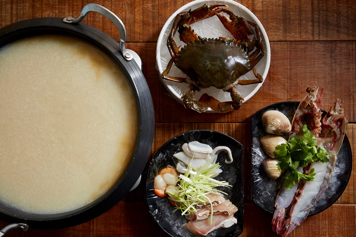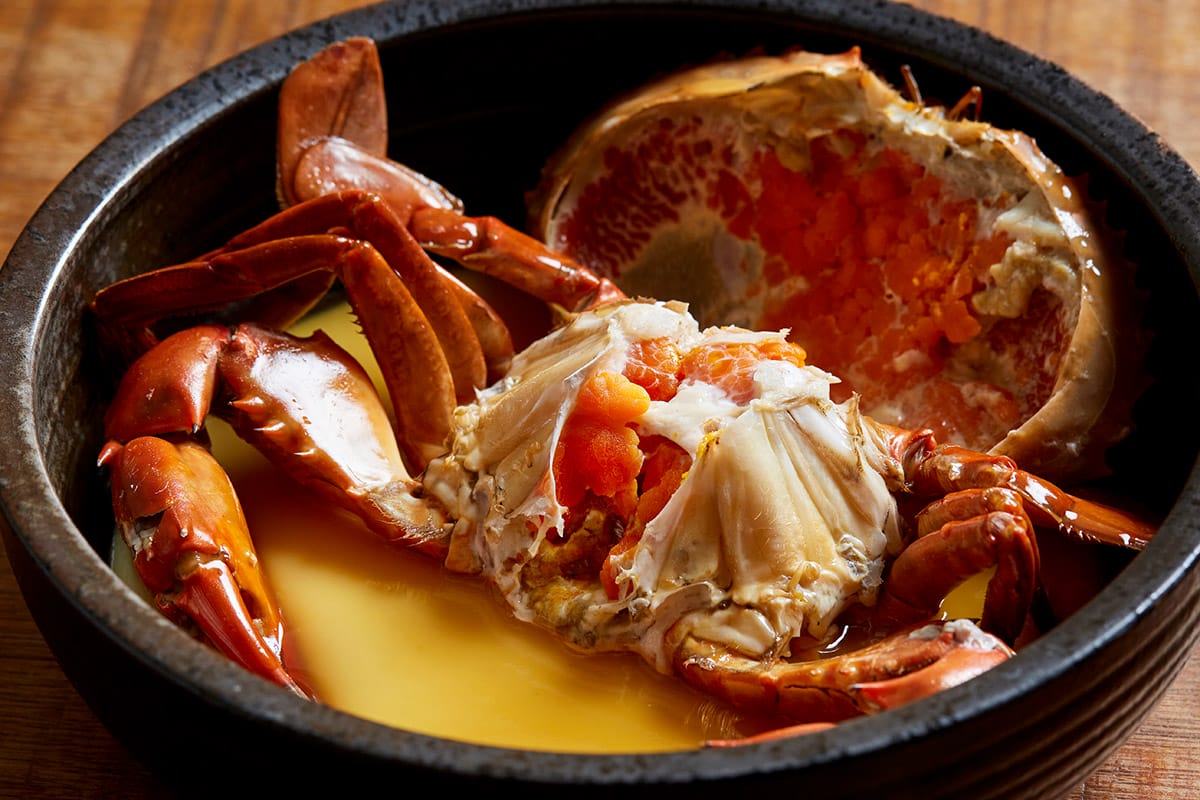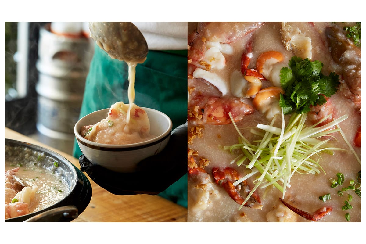 The congee is the restaurant’s signature, and Lai explains how it came to be: “One new year, my friends and I were drunk, and we wanted something to eat. So, I went into the kitchen and came up with this.” With leftover hitomebore rice, smoked eel, and dashi, a dish was born. “I wanted it to be quick, so I used my stone mill to grind the rice grains, which gives it a very different consistency from regular porridge,” he continues. Diners now have the option to add oysters, giant cemiti clams, and red flower crabs, which, according to Lai, are sweeter and richer than the usual blue flower crabs.