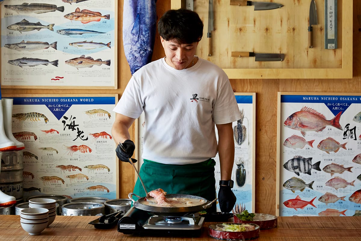 When the iconic Tsukiji outer market closed in 2018, many were dismayed to see it go, but Ken Lai decided to take matters into his own hands. As the founder and owner of Unusual Marketplace, he sought to recreate an atmosphere reminiscent of the old Tsukiji fish market in his restaurant, with vendor signboards and live seafood on display.