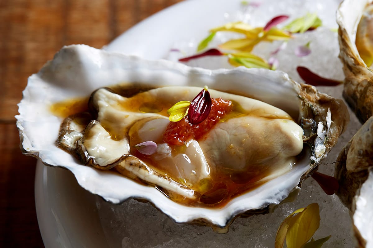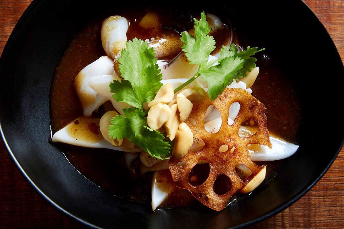 Other highlights include plump Taishan oysters with kimchi and ginger ponzu, roe crab chawanmushi, mala squid, and a seafood ramen served with a 12-hour slow-cooked chicken broth inspired by Japanese mizutaki. “Whenever I am in Fukuoka, I must have mizutaki. So, I came back here, modified the recipe, and incorporated it into our ramen,” Lai says.