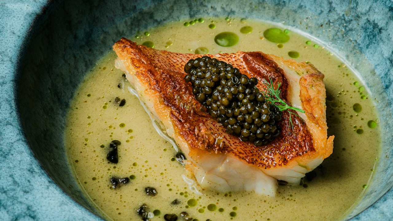 For the main course, a handsome portion of coral trout was prepared sous vide, retaining the sweetness and silkiness of the fish while producing sumptuous bites of beautifully moist white fatty flesh. The addition of spinach, fennel and Amur caviar with its delicate notes created a perfect balance without taking over the character of the fish, while the aroma of savoury mirepoix acted as the dish’s foundation.