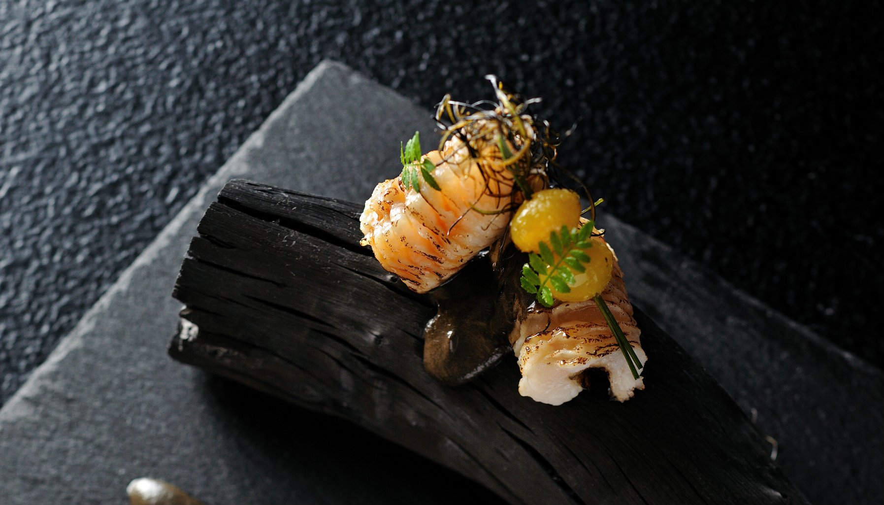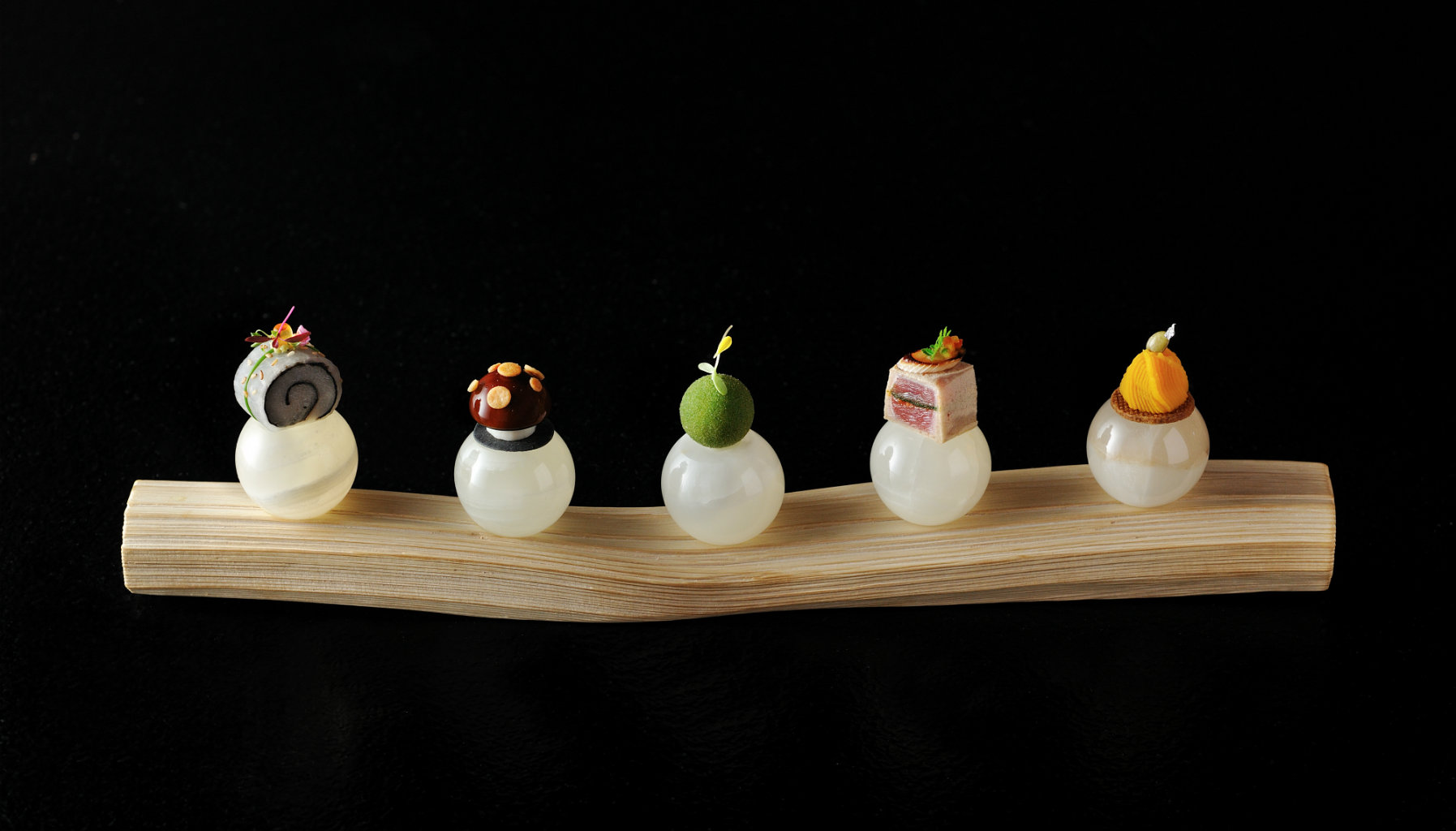 The chef’s signature Five Flavours of Delight appetiser sets the tone for the stunning nine-course meal. Five bite-sized morsels — Japanese barracuda and daikon roll, mushroom soup pop, saury risotto croquette with chrysanthemum leaf powder, tuna with hot green pepper sauce, and weatherfish and pumpkin cream mont-blanc — representing the five flavours (sour, salty, bitter, spicy and sweet) are served on individually chilled or heated stones.