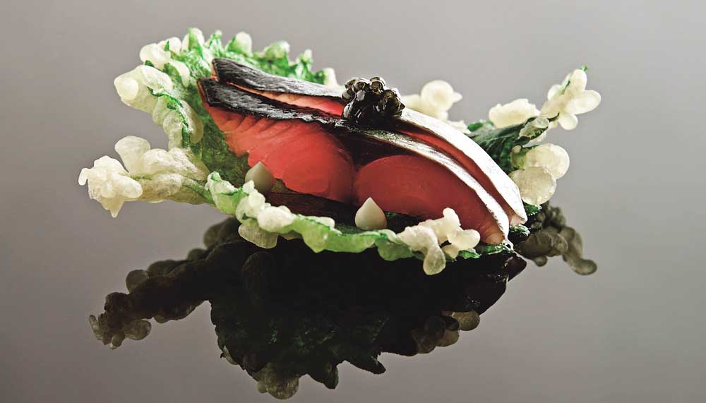 Another inventive dish is the pearl, showing just why accolades have continued to pour in; a sugar ball served on a dark grey bowl gives nothing away until it is cracked, revealing tiny, frozen raspberry bits and powdered gelato that melt in your mouth.
