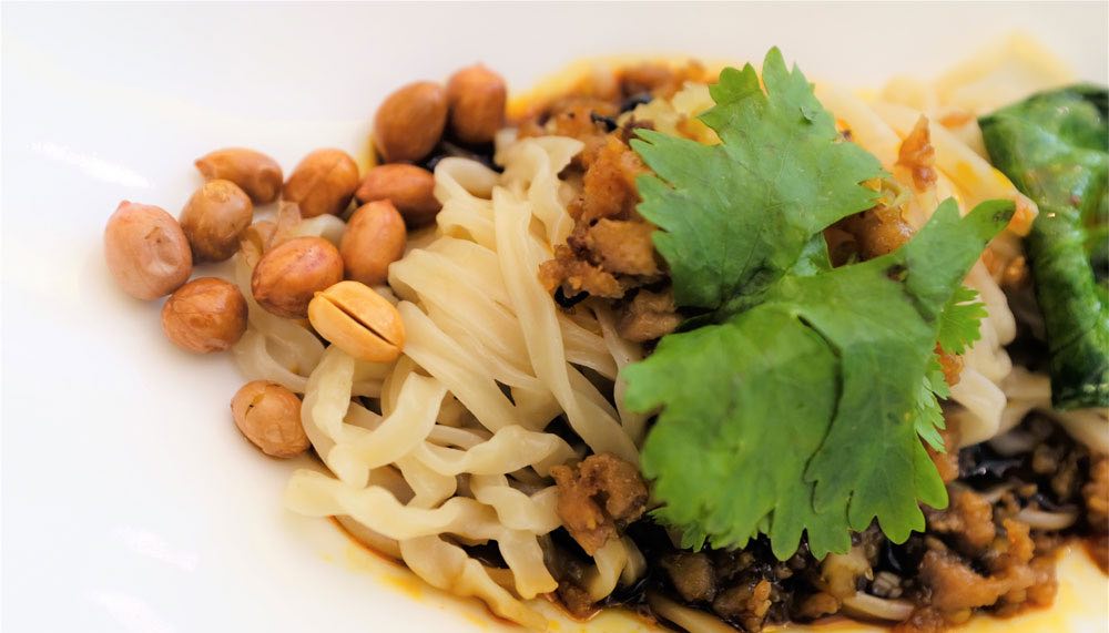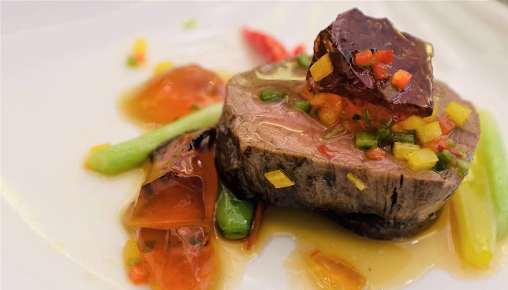 The following plate continued to represent the essence of both Eastern traditions – Jasmine Tea-smoked Golden Pomfret served with a light honey glaze on a shiso leaf. Pan-fried Beef Loin with Vegetables and Wasabi Jelly sauce come soon after, and did well to keep taste-buds interested with mildly spicy tang. In keeping with customs, the last dish before dessert was Chef Toh’s take on “Dan-Dan” noodles. Tossed in potent but tasty chilli-oil and peanuts, these springy hand-pulled noodles ensured no guests would leave without being properly satiated. Dessert was a two-fold affair, with a cold almond pudding and the chef’s signature crispy egg and custard chicks.