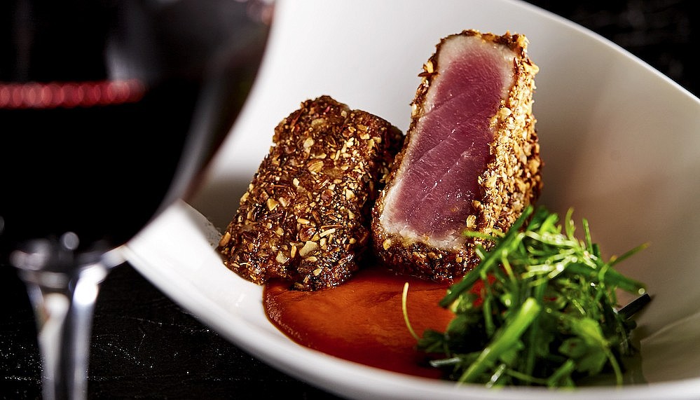 Salad came in the form of a beautifully-plated green bean salad, pumpkin pickles and malt bread crisps with thin cured lamb leg medals. The accompanying Shiraz Katnook Estate 2009 was rich and velvety, while the lamb leg’s mild cure was reminiscent of ham, elevated by the punch of wholegrain Piment d’Espelette mustard. This was swiftly followed by a lovely tuna in dukkah crust, with the red bell pepper coulis adding a hint of Middle Eastern flavours that merged well with the rich Shiraz ‘Prodigy’ Katnook Estate 2009, a limited edition wine that undergoes extended aging.