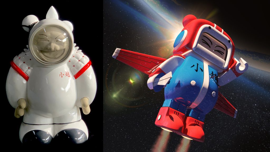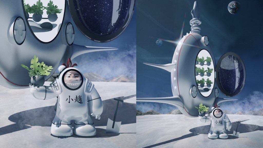 Yap’s series of sculptures are also richly embedded with meanings and symbols of Louis XIII. In a mixed media piece, Yap depicts Xiao Zhao lying blissfully in a bed of lilies (the lily or fleur-de-lis being the logo of Louis XIII) while dressed in the French rugby jersey (following their recent win at the Six Nations). In another, Xiao Zhao is dressed up as an astronaut, with the iconic Baccarat decanter as his oxygen supply. In the NFT version, the same astronaut version arrives on a new planet bearing grapevines as a message of greening the new world, in a spaceship which also bears a striking resemblance to the Louis XIII decanter.