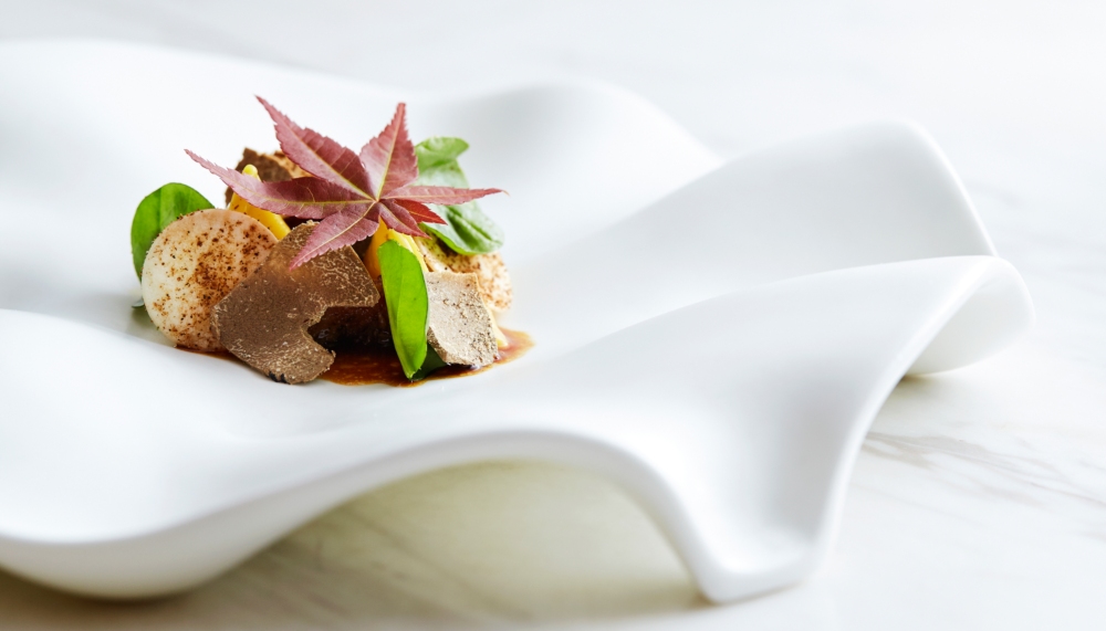 Freshness in flavour and texture characterise the first two courses, a composed salad of three different tomatoes paired with a spicy tomato sorbet and a verdant terrine of Penang mud crab flavoured with Karasumi paste and sealed with balsamic gel. A duo of precious pasta parcels stuffed with saffron-infused veal sweetbreads are a warming autumnal treasure while the Asian inflected dish of foie gras, abalone and fish head glands was inspired by chef’s childhood growing up on the seafood rich coast of Terengganu.