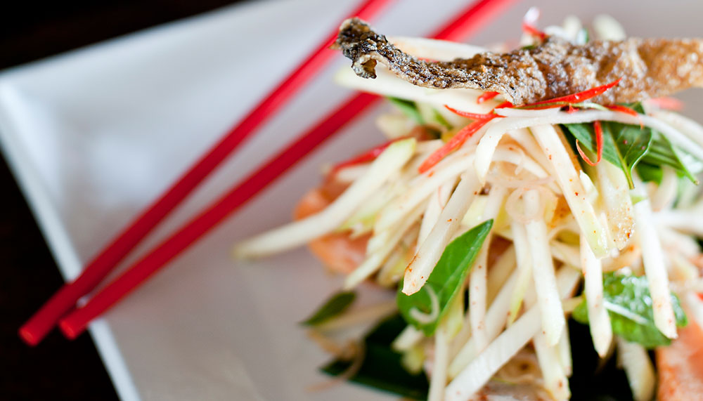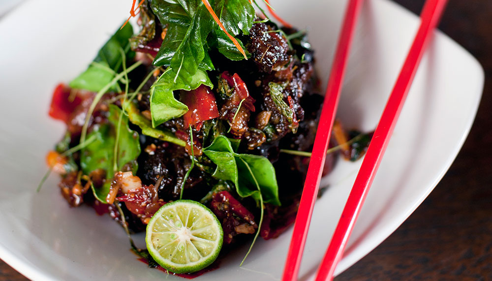 The restaurant, based in Suria KLCC, is only the second international outpost after Mama San Hong Kong, and signifies Melium’s first step into high-end dining in Malaysia. You’ll know the place when you see it – a giant portrait of ‘Mama San’, created by textile designer Justine Missen, gazes down onto her patrons from the main wall. As the ever-authoritative but occasionally indulgent madam of an Asian gentlemen’s club, Mama San’s offerings aren’t to be taken lightly: appetisers like the chicken and pomelo salad with lime leaf and white coral mushrooms are ferociously spicy from the start.