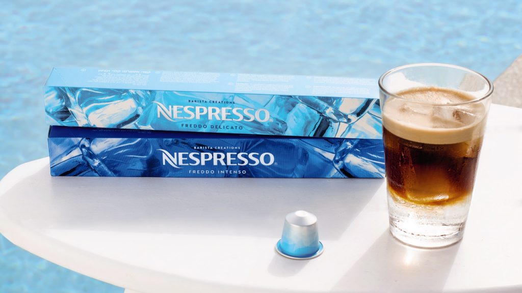 Iced drinks have been getting steadily more popular, especially amongst the young, a trend that has not escaped Nespresso’s noticed. For some time now, the capsule coffee brand has released annual limited editions that are specifically tailored towards coffees of a frosty nature, and this year is no exception. The new additions to the Barista Creations for Ice range have five years of development behind them, time necessary to get the precise characteristics of bean origin, roasting and grinding correct. They arrive as a complementary pair with somewhat self-explanatory naming: Freddo Delicato and Freddo Intenso. Freddo Delicato is a lighter style of Kenyan coffee that concentrates on graceful, fruity and invigorating notes. Freddo Intenso is a darker, bolder blend of South American and Indonesian beans that has a woody intensity that maintains itself through masses of ice.