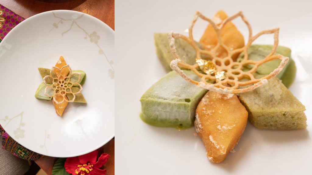 As the meal comes to an end, the most important part of the course finally arrives—dessert in the form of A Green Tea Sponge Cake served with Onde-Onde Mochi and Green Tea ice-cream. The ‘sponge cake’ turns out to be an elevated rendition of the Ma Lai Gao, commonly sold by street vendors in Malaysia. Chewy yet fluffy, I am delighted by the crossroads of the traditional Japanese mochi with Malaysia’s beloved Ma Lai Gao.