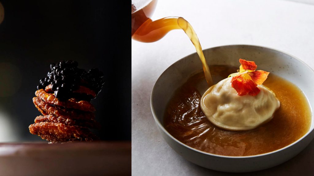 A mound of gold band snapper mixed with creme fraiche and yuzu kosho paste for pepperiness is presented beneath overlapping petals of sliced plums and pink Mexican creeper flowers. Slices of charcoal-kissed Hokkaido octopus on a bed of daikon radish purée darkened by squid ink are lightened by roasted herb oil and cosmos fronds. An enormous ravioli, silky-skinned and plump with ricotta, is bathed in an earthy, wonderfully savoury onion dashi, followed by an even richer Australian Wagyu rib cap – served daringly rare with pickled mustard greens to temper its marbling score of nine.