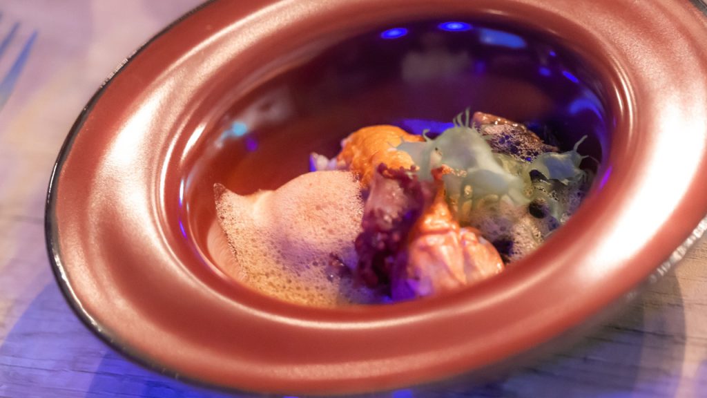 The accompanying canapes which arrived would similarly bear marine-inflected characteristics and names. Sea Layers – a nigiri-style bite of nori mille-feuille, puffed tapioca, wagyu tartare and edamame. Puffins turned a humble muffin into a textured delight with sweetcorn, dill spinach cream, pickled cucumber and caviar, while Erosion recalled Vietnamese flavours with the Phu Quoc honey truffle on 24-month Iberico ham, burrata toast, thyme oil and lemon gel.