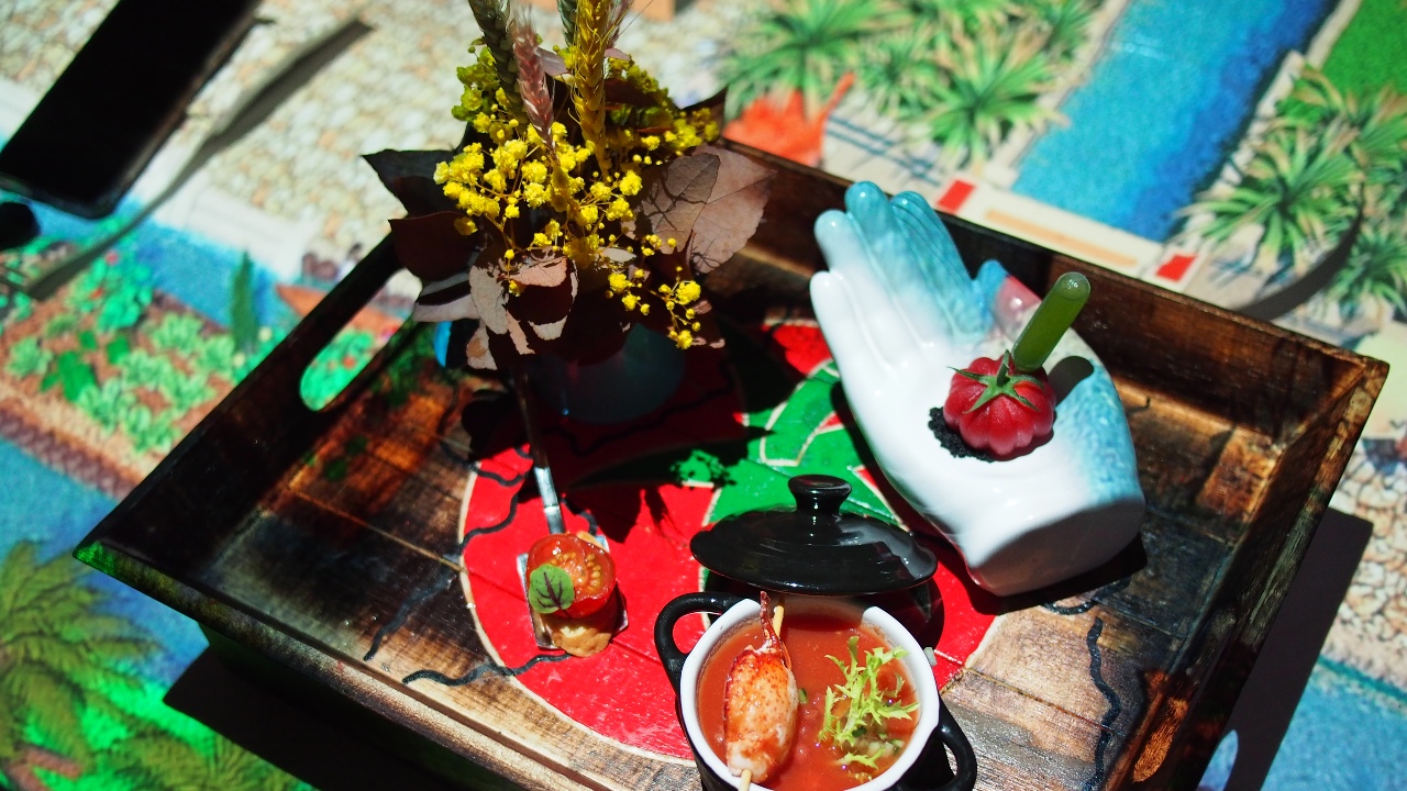 In lesson one, Le Petit Chef explored the ‘History of Food’, taking us back to the roots of the culinary origins of the humble tomato. Through a brilliant 3D projection, the table transformed into the capital city of Tenochtitlán, where the Aztecs grew tomatoes on ‘chinampas’, also known as floating gardens. Three unique combinations were served as we unravelled the story behind the tomato—a French tomato terrine with buffalo mozzarella filling, Italian sun-dried truss tomato bruschetta and a Spanish gazpacho with lobster claw—bringing us on a journey around the world.