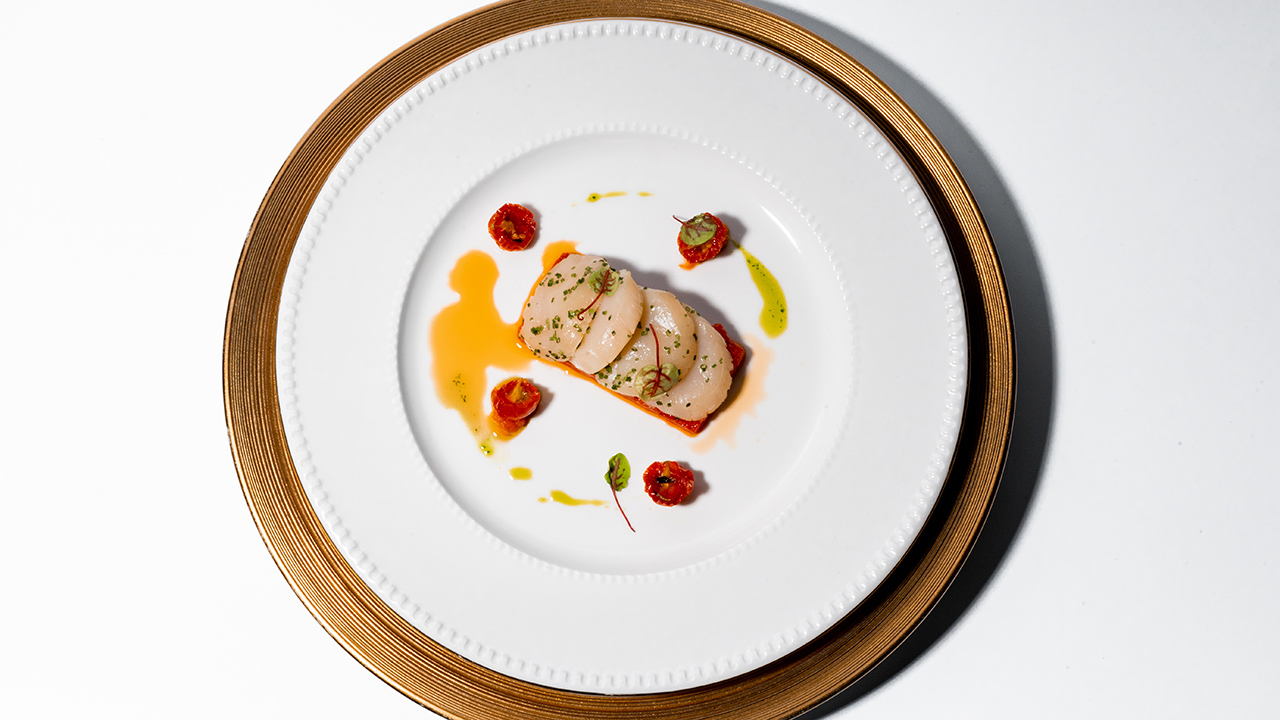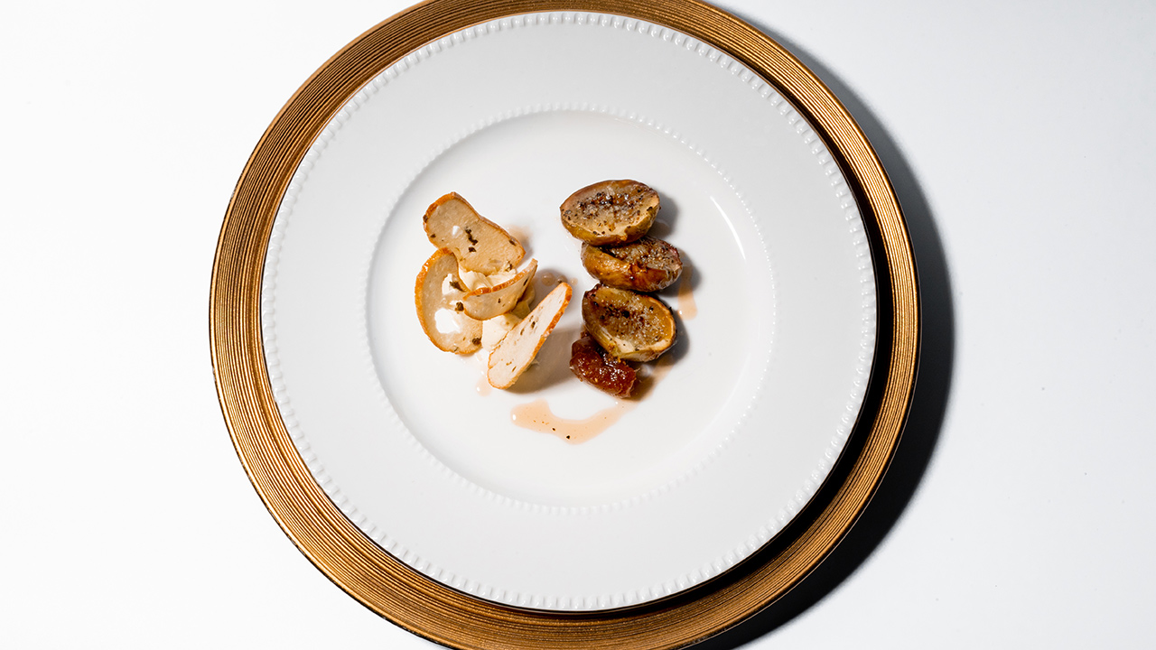 Diners have a choice of either Hokkaido scallops or tea-smoked sturgeon for starters. The scallops are lightly seared and served with semi-dried Japanese amera tomatoes, combining the inherent sweetness of the scallops with the sour and sweet qualities of the tomatoes for a refreshing dish. The sturgeon however, which is sourced from Tanjung Malim, is seasoned and smoked with bain de roses tea and celeriac purée, enriching the fish’s mild taste a wonderful umami kick.