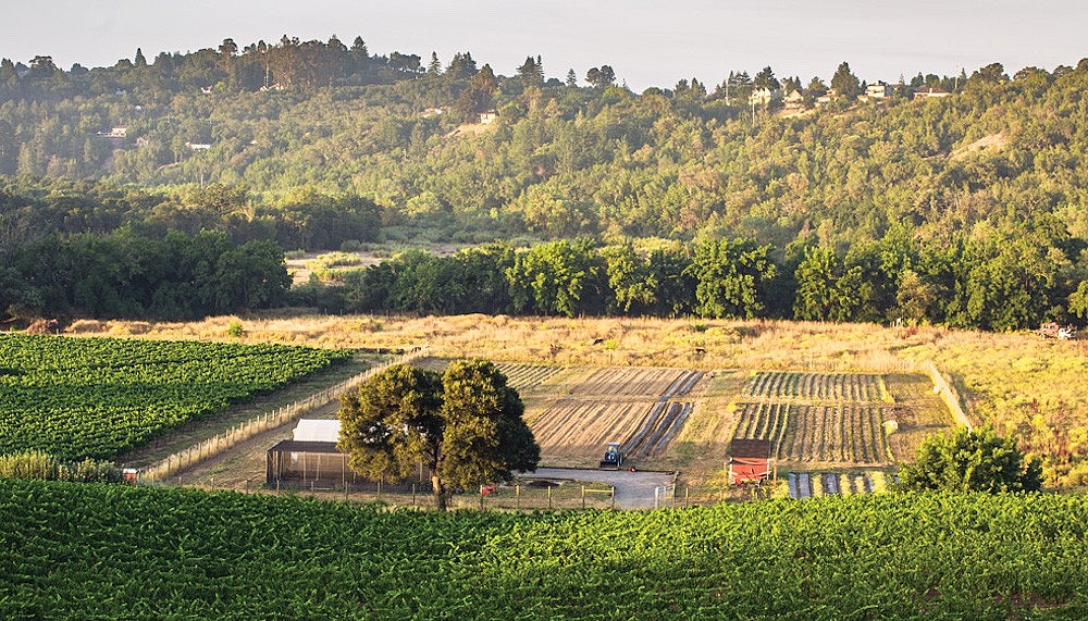 The 11-course tasting menu opens with a panorama of the Sonoma Coast. A serving piece made from driftwood, cloaked in soft moss from the farm, holds a dozen small bites representing what is at its peak that day — malted potatoes with smoked turbot wing, roasted beets with citrus and umeboshi plum, and pickled kushi oysters with fresh wasabi and olive oil. The meal, which is built around the produce Katina grows at the farm, gracefully progresses through such courses as cured foie gras with pear, chicory and rooibos tea.