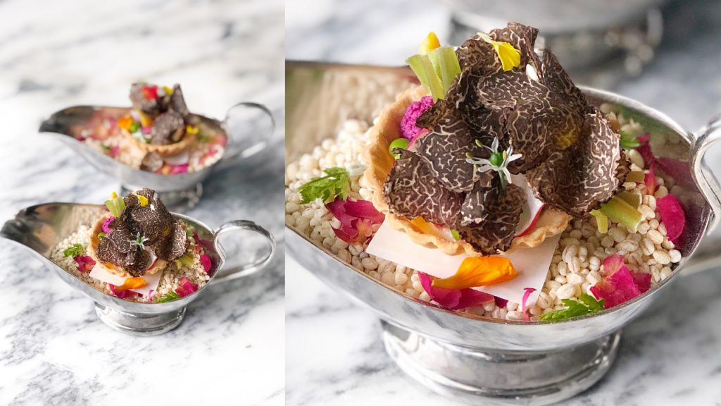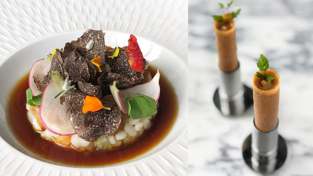 Dinner guests can look forward to dishes that truly reflect Chef Clement’s childhood in Versailles and the regions of Southern France. Start with the amuse bouche of royal oyster, snail croquette, vegetable tartelette and lobster bisque followed by a clear beef broth with sweetbread, barley, cress and black truffles. The appetiser is a delightful torched ocean trout, trout roe and crispy fish skin garnished with Jerusalem artichokes, green pea and parsley emulsion.