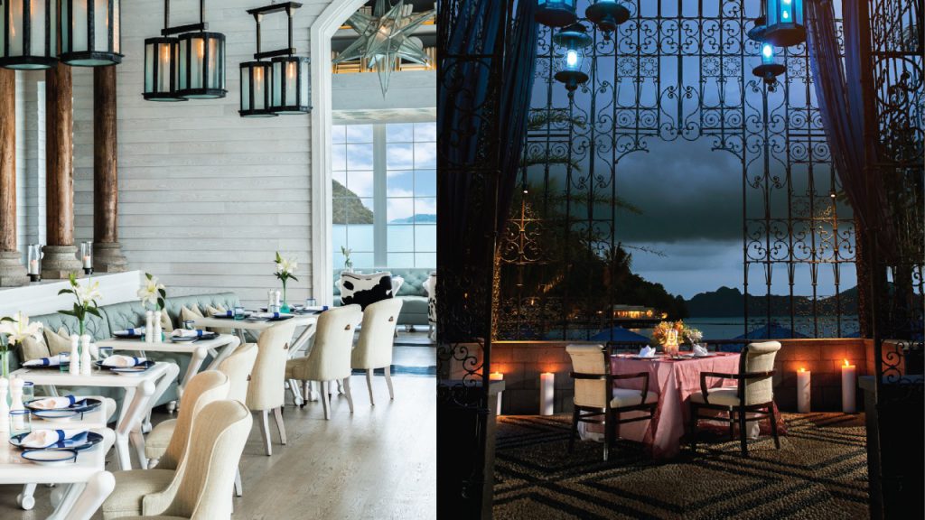 Step through the century-old wooden doors – repurposed from the Dutch embassy in Yangon – and you’ll find yourself in the wonderfully eccentric interiors of Kayuputi, resplendent with its dazzling white interiors, albino peacock tail feathers and 60 teak columns inlaid with camel bone from India. Towards the back, the restaurant opens up into the gorgeous Pavilion bar of cosy overwater hammocks, where guests can take in the sweeping views of the sea birds swooping into the water and distant mountain ranges, all the while enjoying delicious aperitifs before their Asian-inspired haute cuisine dinners in Kayuputi.