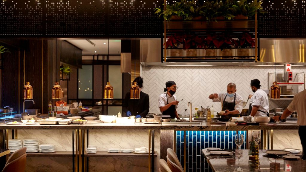 Those who know Bukit Bintang well will no doubt remember Shook! from its Starhill Gallery days, both for the vast variety of dishes available at Shook!’s buffets and its memorably theatrical dining experiences. It now returns to Kuala Lumpur’s restaurant scene in gleaming, polished form, with dove-grey banquettes and chairs that diners can ease into for the evening, muted gold panels on the ceiling, and paths of basketweave marble tiles that guide new guests in.
