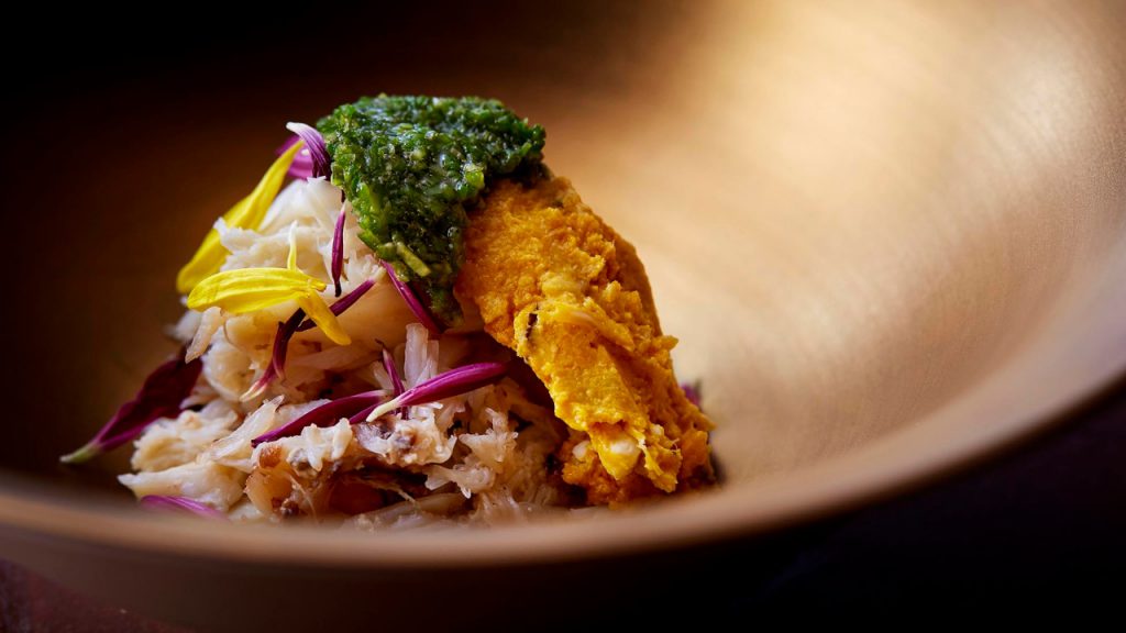 To open, an autumnal cornucopia is offered with Pacific saury nestled between young gingko, shaved chestnuts, mushrooms and plum sauce. The menu here naturally adheres to the ingredient season, which is why you find Shanghainese hairy crab used to add new layers of umami to a kani salad, comprising blue crab from the waters off Miyagi prefecture, mingled with chrysanthemum petals.