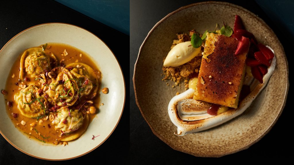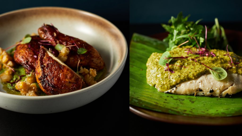 These two flavourful vegetable-forward choices pair well with the sea bass cooked with botanical pesto. Wrapped in a banana leaf, charcoal grilled, and then topped with an ulam salad, the lightly seasoned, perfectly cooked sea bass is flaky and juicy with a delicious herbaceous tang that refreshes and flavours the palate at the same time.