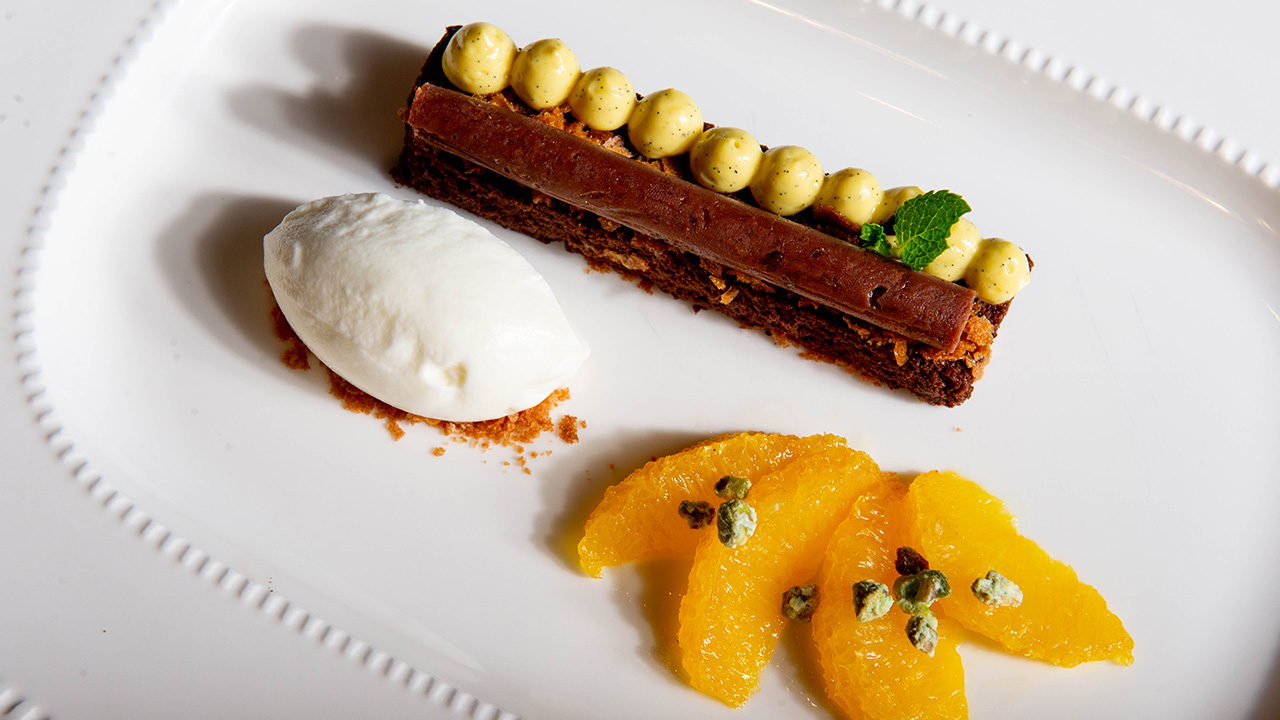 To finish, choose from either mille-feuille d’igname or chocolate torte. The buttery, flaky pasty that is the mille-feuille is filled with yam and topped with Madagascan vanilla cream and homemade ice cream. The chocolate torte however, is made using a blend of Manjari and Jivara chocolate, along with hints of orange and vanilla.