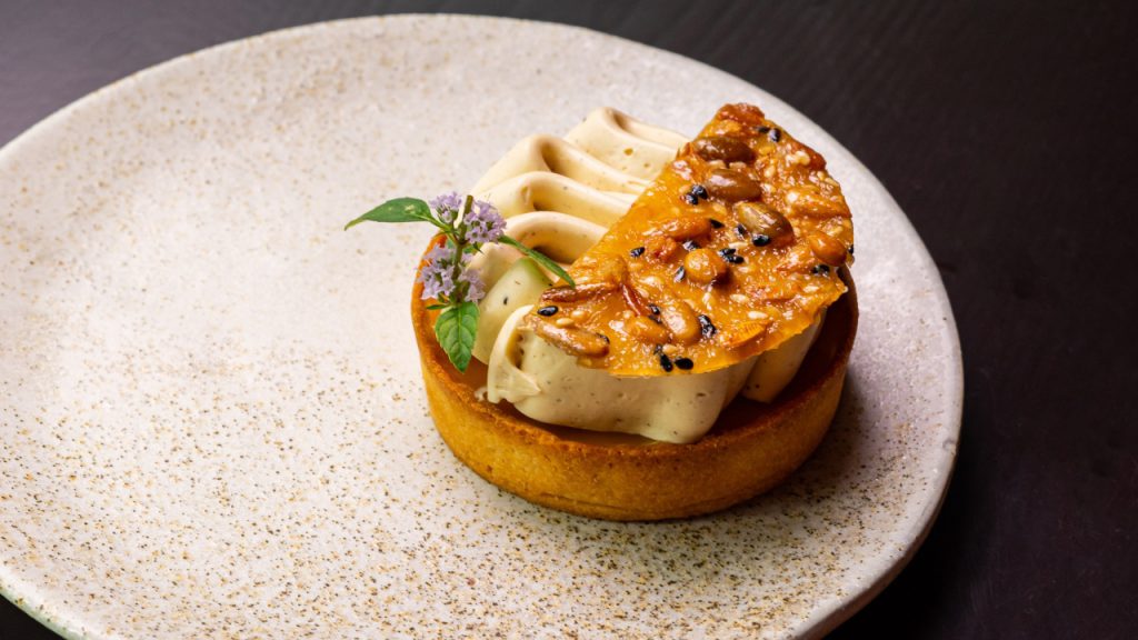 The meal opens with a Korean style seafood and scallion pancake, pumpkin and pear kimchi ssam (a wrap of explosive flavours dipped in a rojak sauce or gochujang sambal), followed by duck tongue and jicama dumplings served in a smoked duck broth. The mains: a comforting grilled coral trout and claypot cooked burdock rice, and Percik-style lamb ribs served with a selom salad.It hits the home stretch with a light toasted barley tea cream tart with a sweet pistachio praline on top.