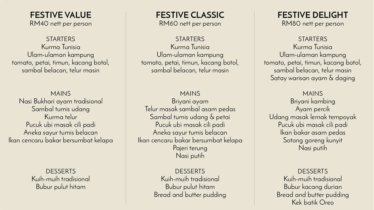 No matter which package your decide, diners will receive Tunisian dates and a mixture of ulam-ulaman kampung such as tomato, petai, cucumber, roasted peanuts, sambal belancan and salted egg for starters, as well as a selection of traditional kuih-muih and bubur pulut hitam for dessert.