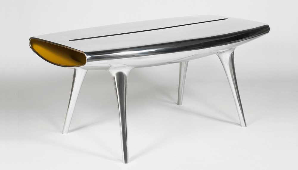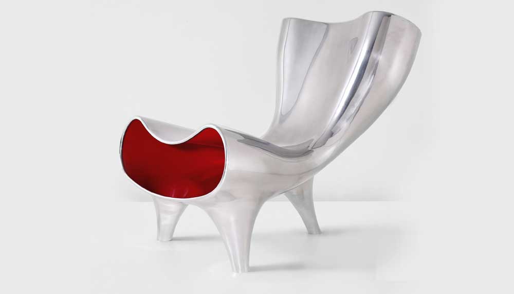Most of his designs reflect his distinctive, colourful, curvy, organic, materials-driven aesthetic, in which everything and anything from shagreen to carbon fibre to polyethylene to steel might play on his palette. This is the man who made a shelf from a five ton block of marble and decked a speedboat in micarta – made from layers of resin-laminated linen. But, he suggests, he has also had good timing on his side: the fact that many manufacturers and consumers are only now, it seems, waking up to good design’s potential.