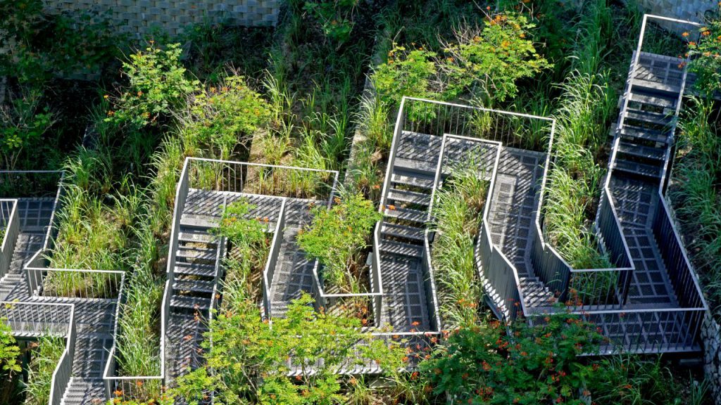 The challenge of reconciling the ground level with the podium floor where the lobbies are located to both towers, was cleverly resolved via the creation of a mini hiking staircase comprising 275 steps, requiring a mere distance of 375 metres to traverse 30 metres in terrain height. Along the way, gazebos with weaver bird nest-like cabanas offer temporary refuge and a place to unwind.