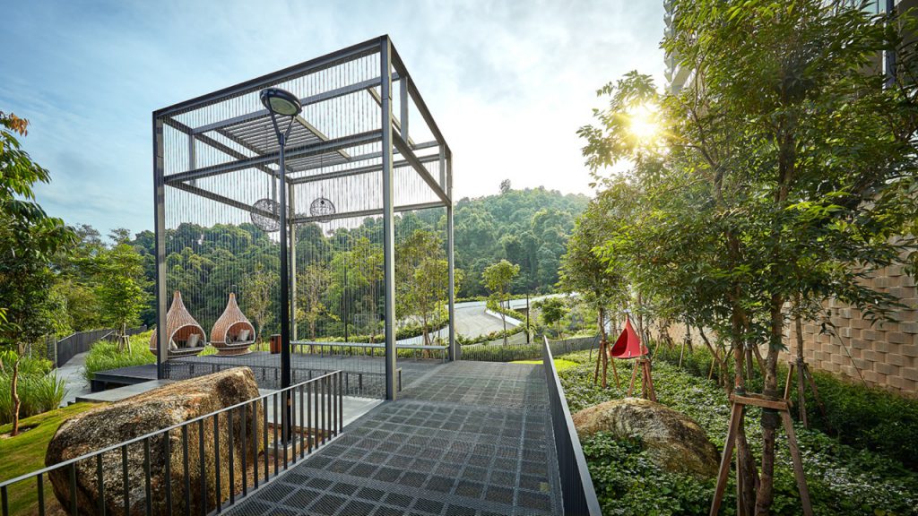 “’Steps to Paradise’ is the design concept which we proposed for the landscaping due to the unique elevation of this project,” Phua begins. On the ground, one finds terraced gardens, the winding river (which can also symbolise a meandering river), and observation towers. Meanwhile, the sky portion is reflected through the lush landscape of the sky deck, and the observation areas which offer a vantage point for residents.