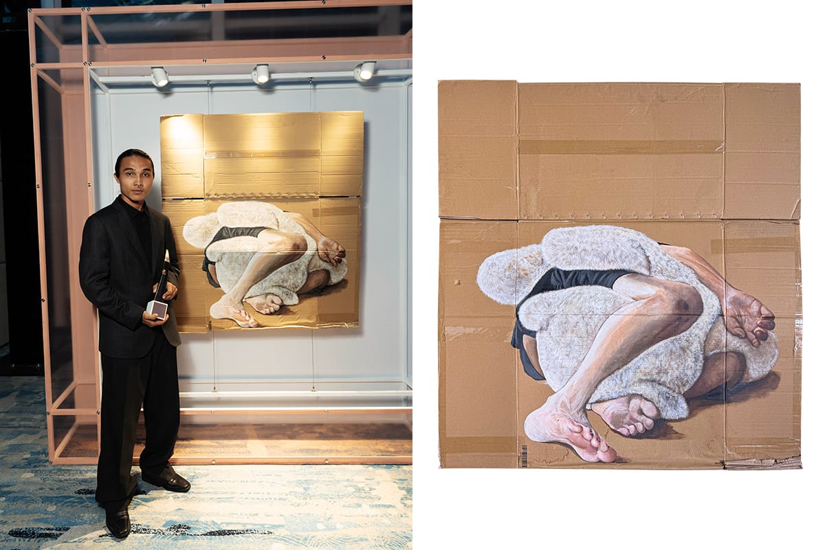 Meanwhile, in the Emerging Artist Category, Putra Aqmal Danish Bin Mohd Zuraimi took home the title of Most Promising Artist of the Year with his artwork, I Love You, Bearbear. The piece lays bare the hardships of homelessness and the deep void of human connection that defines such realities. Using cardboard as his canvas, he repurposes an overlooked medium into an emphatic portrayal of survival and dignity.