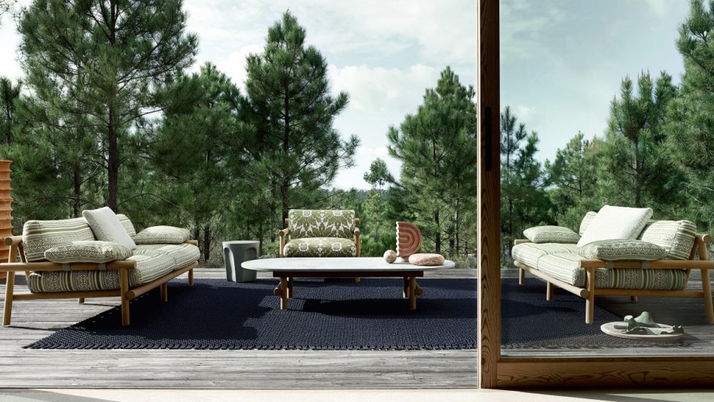 You’ll quickly notice the zen aspects of the Ayana collection, with its protagonist being Naoto Fukasawa. His work on this outdoor collection is premised on Forest Stewardship Council (FSC)-certified natural teak and looks like a careful setting of sticks in place. The genius is in the concealed technical solutions to allow invisible joints and only wooden pins in place of metal elements. This lets the wood continue its serene transformation as weather conditions change, without the danger of irreversible cracking or deformation from intervening metal parts.