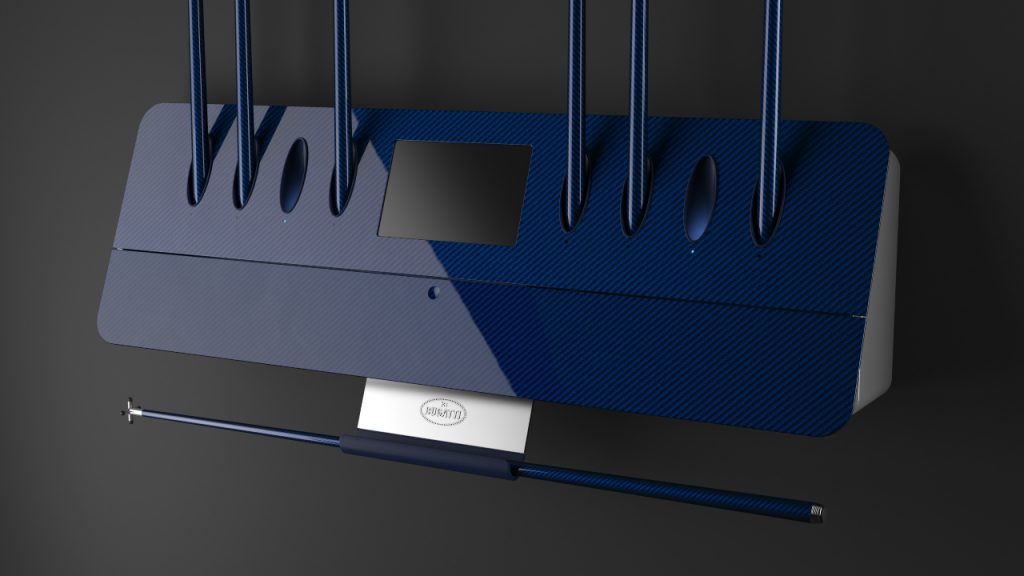 Owners of the Bugatti pool table will also find that carbon fibre is used in the wall cue support, which features a 13-inch, high-resolution touch screen to keep track of scores. And in a nod to the automaker’s range of vehicles, the anodized aluminium ends of the carbon fibre pool cues echo the signature design of the buttons in Bugatti’s hypercars.