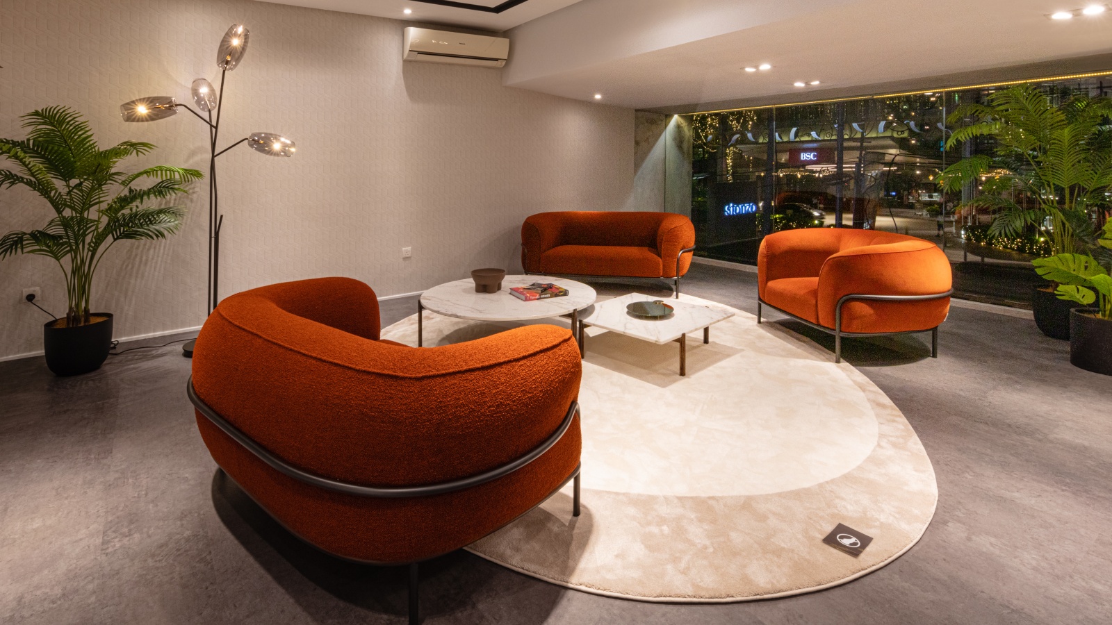 The large Bolle chandelier is the living room’s centrepiece, while Audrey sofas complete with matching pouf and side tables welcome guests and help pull the room together. The Brera walut bookcase is rendered in a special Lava-coloured liquid metal finish and framed by custom Gallotti and Radice boiserie. Modern antiques and artwork from Officine Saffi lift the otherwise classic space with new energy, while the LG sound box plays your favourite ambient tunes.