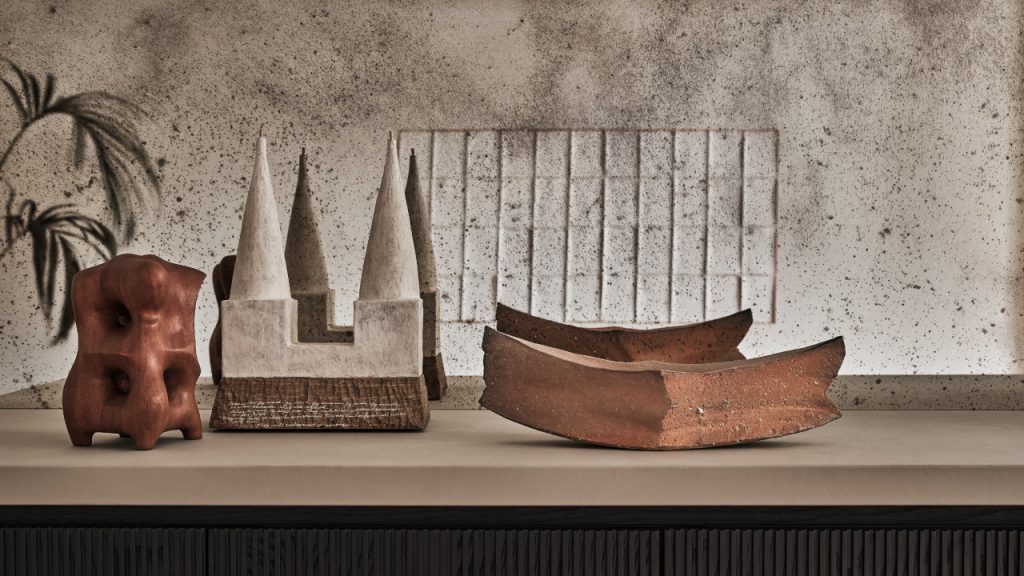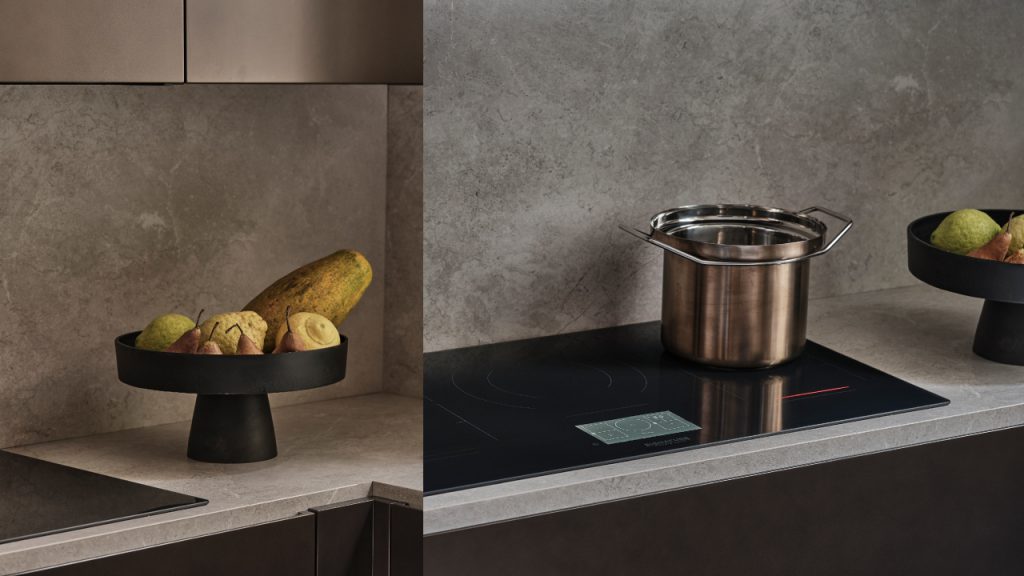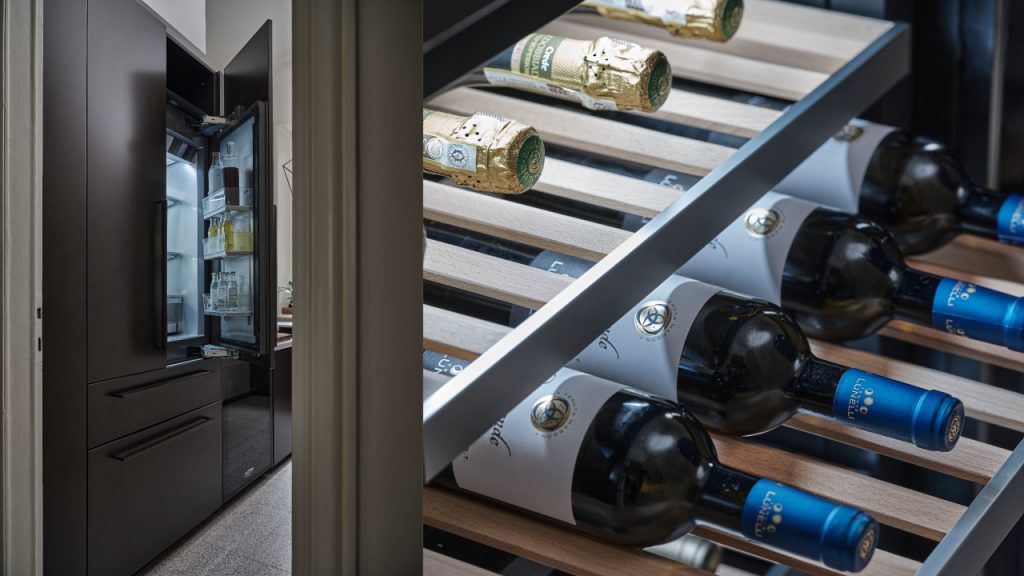 The kitchen, created together with Binova, showcases an L-shaped area with a large Atriostea worktop making-up part of the space. Meanwhile, the other half features a storage space with large columns that feature Signature Kitchen’s latest range of appliances including a wine cellar undercounter, French Door refrigerator, a multifunction combination steam over, and induction cooktop. Fine finishes in bronze tones to reflect the light into the room in magical chromatic effect and signed artwork by Nicolas Denino further define the space.