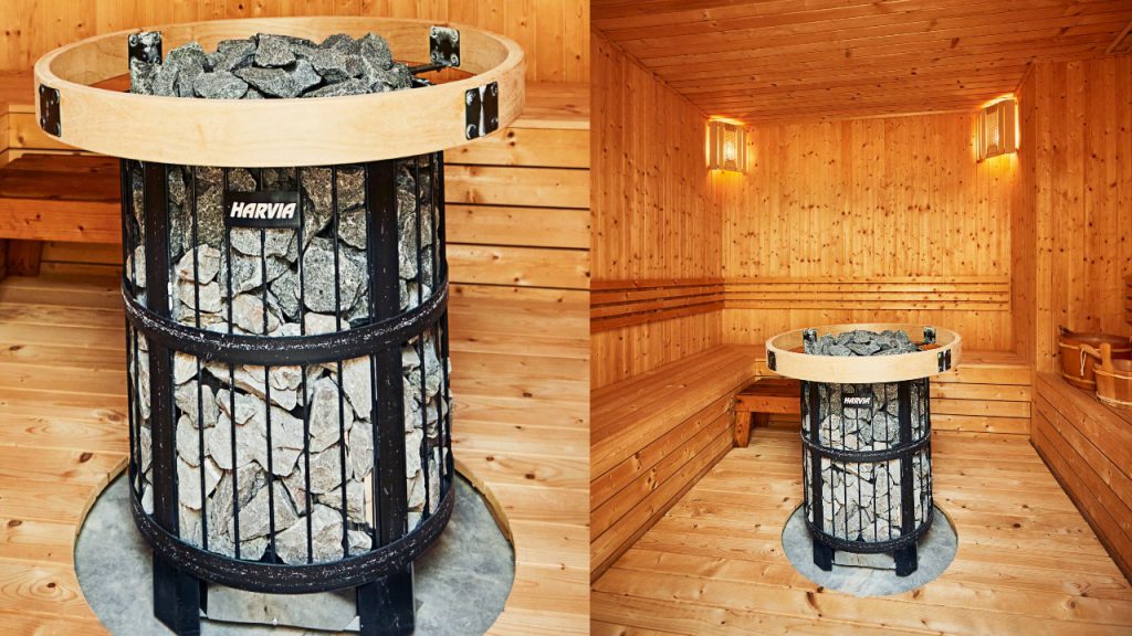 On the pool deck is a steam room powered by a specially imported Finnish Harvia wood-heated sauna heater. Its circular design evenly distributes heat, ensuring efficient sauna use and making for relaxing post-swim rituals.