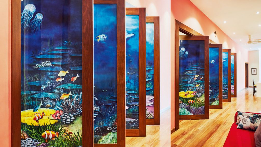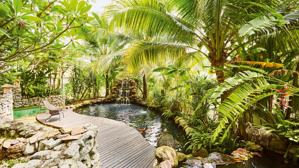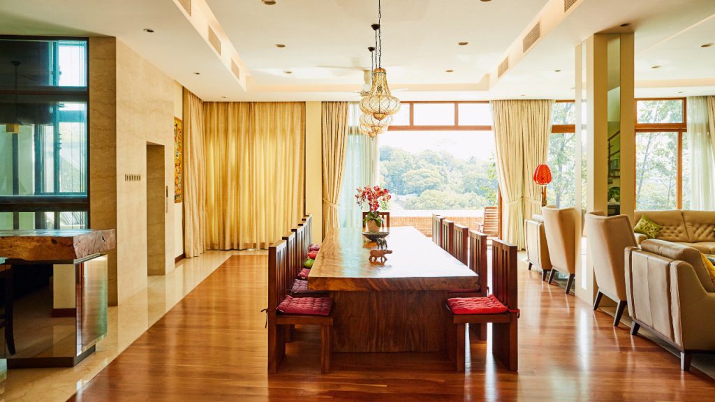 For a bit of the outdoors and with all the social distancing you need, the beautiful twin koi ponds offer relaxation in a garden crafted by a professional arborist. The fish thrive courtesy of a bio-filter under the wooden decking, which eliminates ammonia to produce fresh water. Garden lamps and a water feature purchased some years ago from Bali – directly from the late Australian landscape artist Made Wijaya – gives this tranquil patch of green a touch of exoticism. So too does a sea coral garden, frangipani, coconut palms and eucalyptus trees, which peel off during Kuala Lumpur’s thunderstorms to produce a kaleidoscope of rainbow colours on its trunk. “This place really came alive when we completed the garden and we now get bees and squirrels,” the owner observes, adding that he would be delighted to harvest eucalyptus honey at some point from the trees in the garden.