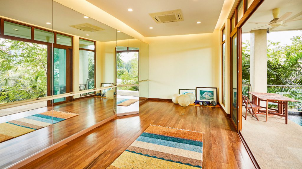 This house’s gym is constructed to professional standards with its teak floors laid over a rubber base to minimise the impact of workouts. The barre was installed for the owner’s wife who dances ballet, and one of its mirrors conceals an en-suite with shower, toilet and book-matched marble tiles.