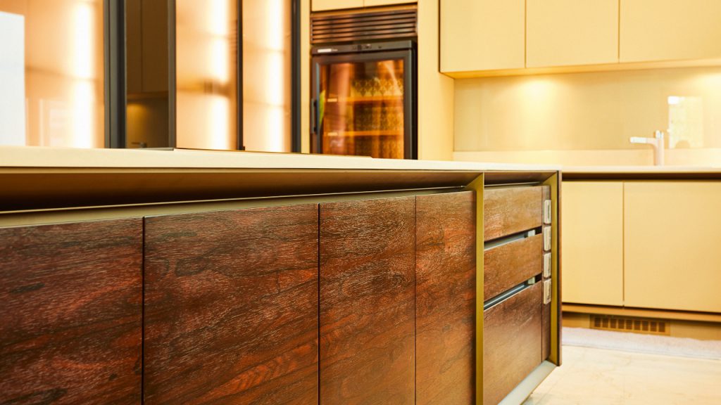 Perhaps the most impressive part of the dry kitchen is the Boffi island, which is impressively book-matched on both the outside and the inside. An adjoining counter made of lychee wood provides a pleasant spot for morning coffees and confers an organic touch to the living space.