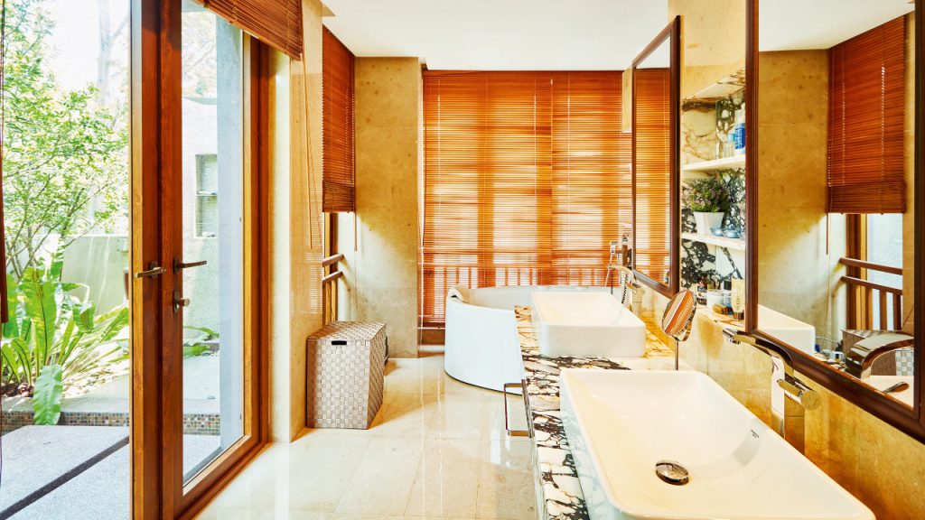 The pool deck of this Damansara property offers million-dollar views over the verdant Damansara Heights neighbourhood and tree canopy, with the welcome sound of birdsong and rustling breezes. In the day, you can bask in the sight of Kuala Lumpur’s key landmarks and kinetic skyline, from the Merdeka 118 skyscraper – poised to be the world’s second tallest building – to the iconic Petronas Twin Towers, Exchange 106 at TRX City and the slender Kuala Lumpur Tower. The pool is laid with rose gold and purple gold Bisazza mosaics and the hot tub catches the heat of the sun in the day, releasing it back at night as one soaks in the view of the city lights.