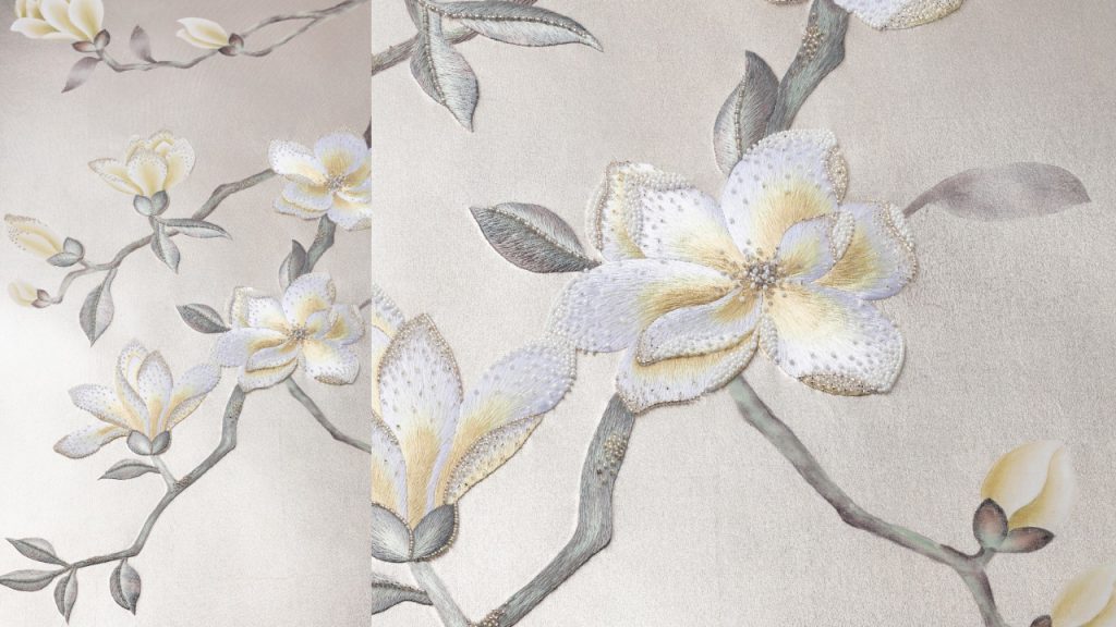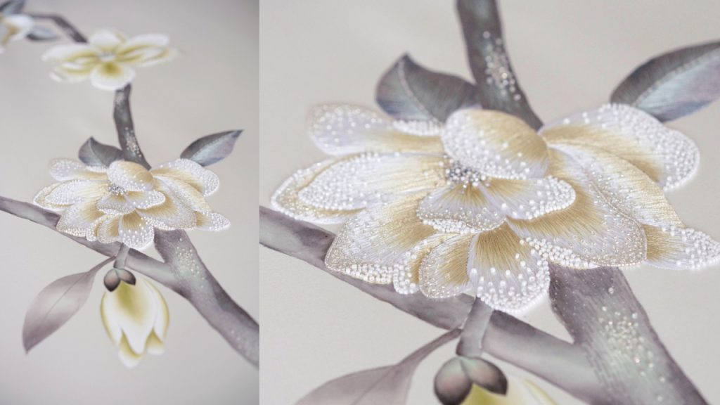 On this specific Magnolia Canopy wallpaper, the base is Rose Water slub silk. Slubbed silk is a sturdy and natural silk fabric with a distinctive, irregular texture – thereby ‘slub’ silk. Different-sized brushes are then used to daub and paint the canvases, adding elements of depth, contrast and realism especially to the flowers.